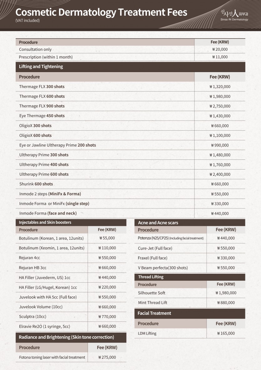 Sinsa in Dermatology, Cosmetic Dermatology Treatment Fees